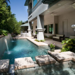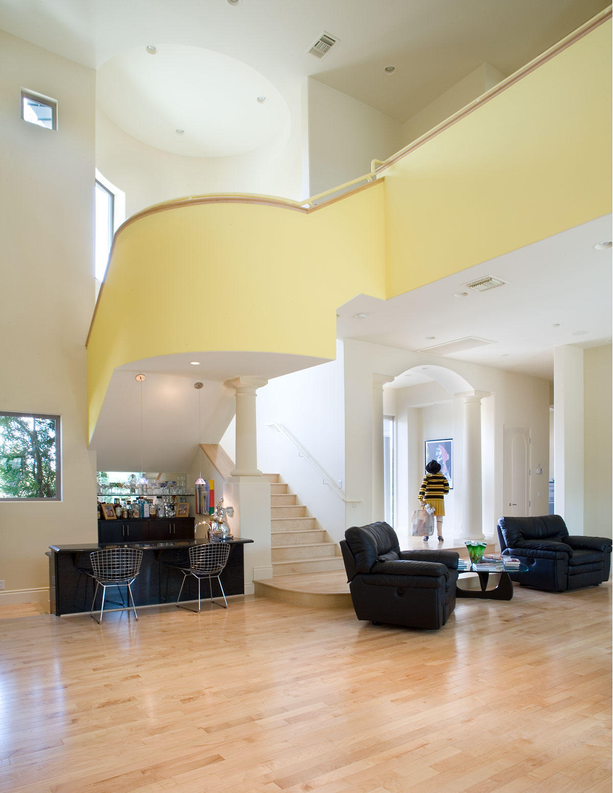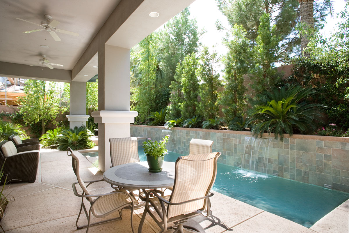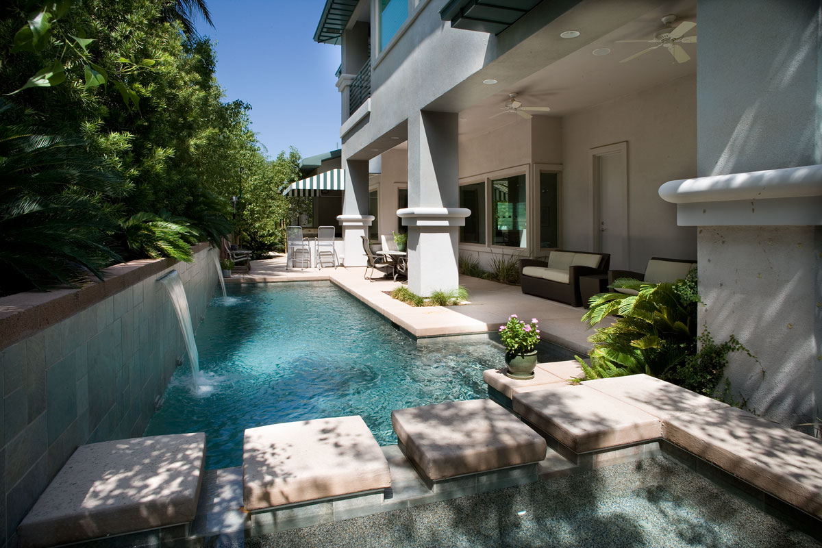 Two story contemporary home with a custom gourmet kitchen, dining, and wet bar. We maximized the usage of this small corner lot property with a custom swimming pool, spa and fountain, and barbecue and putting green area.